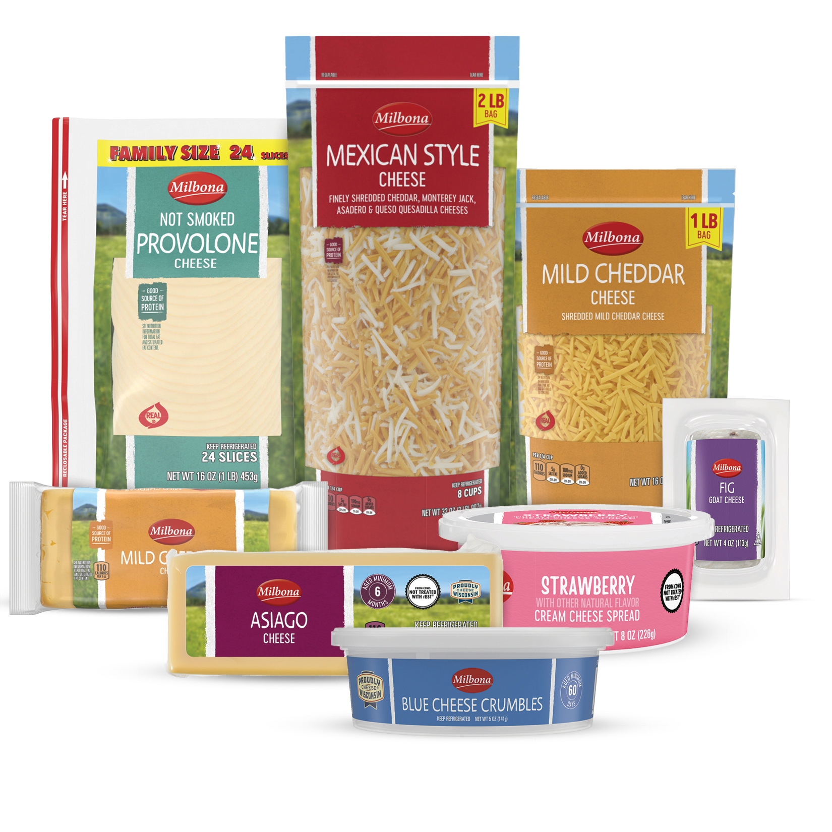 Milbona Cheese encompasses over 50 SKUs developed over a 6 month timeframe. The design goals were to evoke a sense of freshness through use of field imagery, differentiate SKUs through use of color variety, and engage consumers with playful fonts